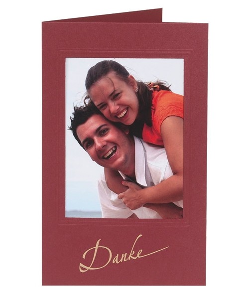 Die metallic-rote Fotokarte wird nach links aufgeklappt. Auf der rechten Seite ist Platz für Ihren Danksagungstext.