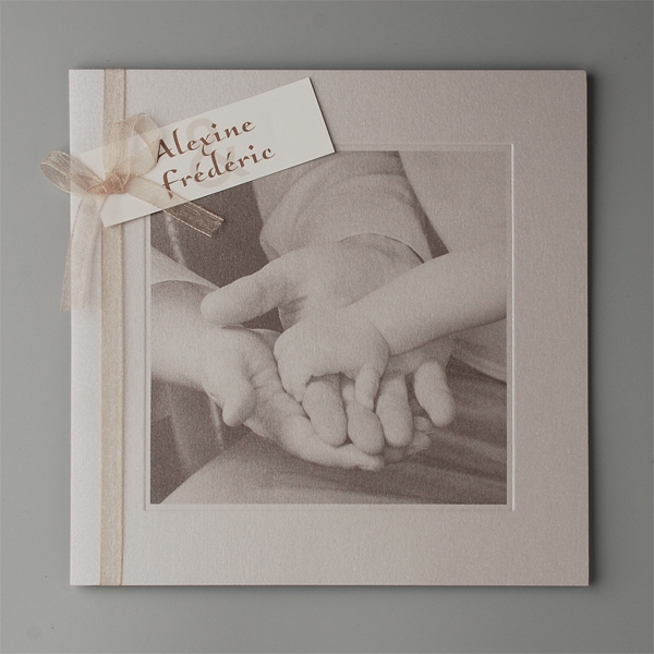 Die silberne Außenkarte und die cremefarbene Innekarte mit Glitzereffekt werden durch ein cremefarbenes Organzaband verbunden. Am Bändchen hängen 1 oder wahlweise 2 kleine Kärtchen, die man mit Namen und Hochzeitsdatum versehen kann. Die Innenkarte wird zudem innen rechts in die Außenkarte gesteckt.