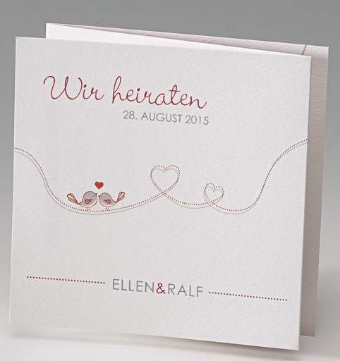 - Individuelle Beschriftung auf der Vorderseite möglich, z.B. mit den Namen, dem Datum oder dem Schriftzug "wir heiraten" (unbedruckt wird diese Karte nur mit dem Vogelmotiv und ohne Text geliefert)